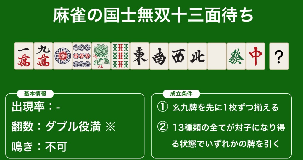 - 和了形: 国士無双では、特定の和了形(完成した手)を持つことで、自摸やロンで勝利することができます。