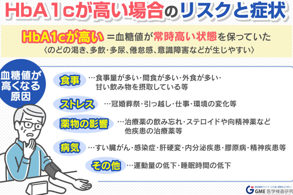 高いHbA1c値は通常、糖尿病の診断基準を満たすことが多く、その結果、多くの合併症の発生リスクが増加します。具体的には以下のようなものがあります: