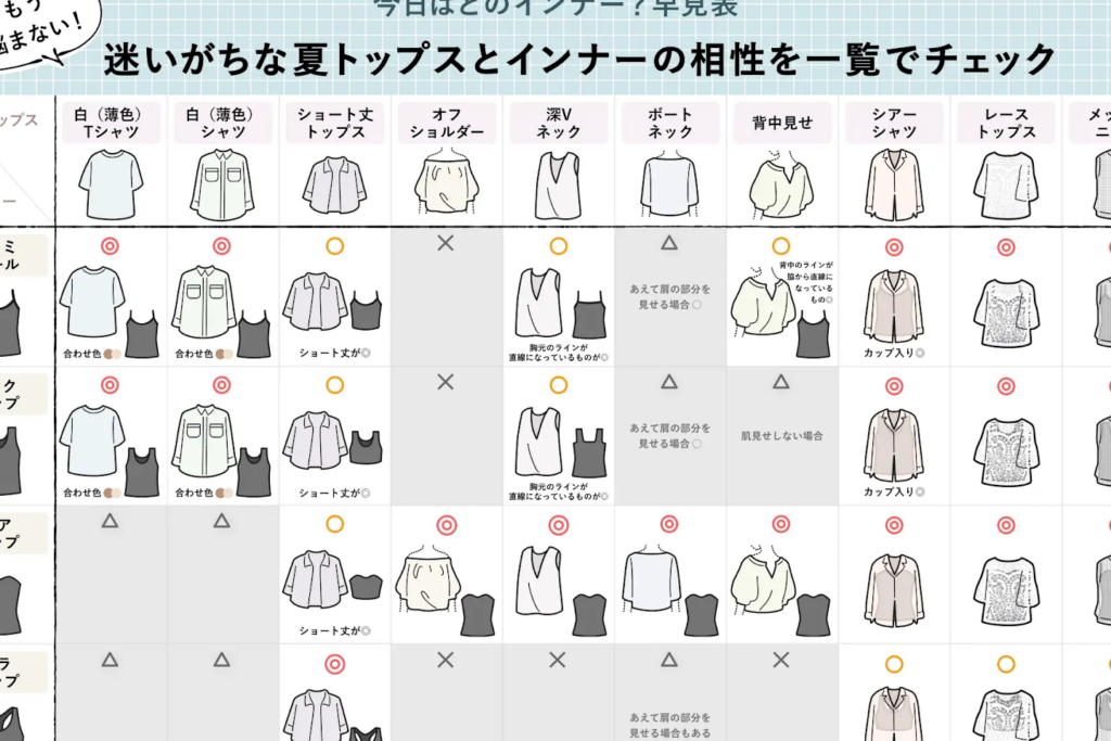 | Vネックインナー + タイトスカート | 女性らしいシルエットで大人っぽさを演出できます。 |