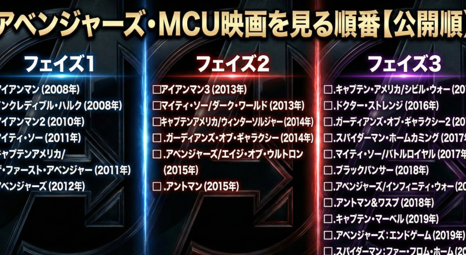 MCUは複数のフェーズから成り立っており、それぞれに独自の物語とキャラクターが存在します。以下は、おすすめの視聴順序です。このリストは最新作まで反映されていますので、ぜひ参考にしてください。