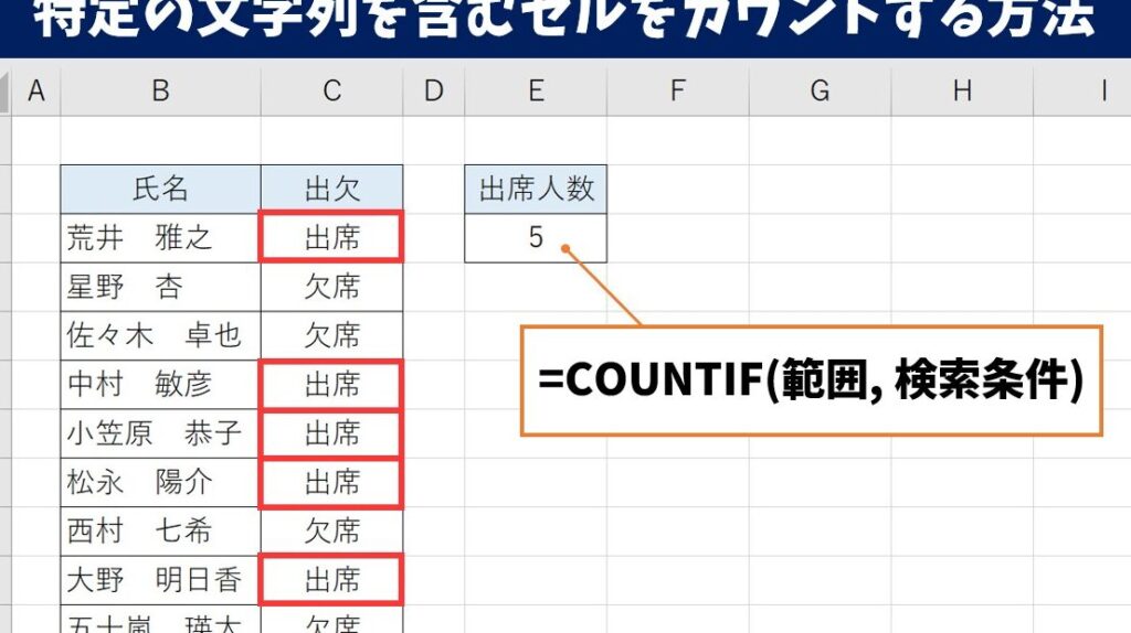 =COUNTIF(範囲, 条件)