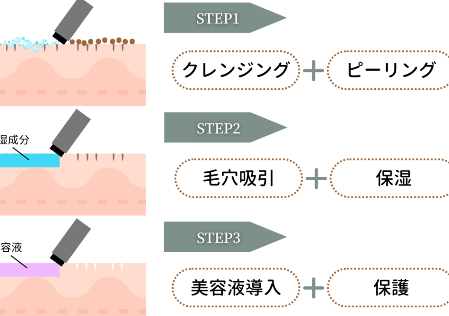 クレンジング : 特別なデバイスで肌表面の汚れや古い角質を除去し、次のステップへの準備を整えます。
