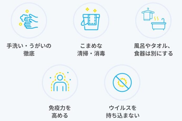 - 消毒: 家庭内のよく触れる場所(ドアノブやリモコンなど)は定期的に消毒します。