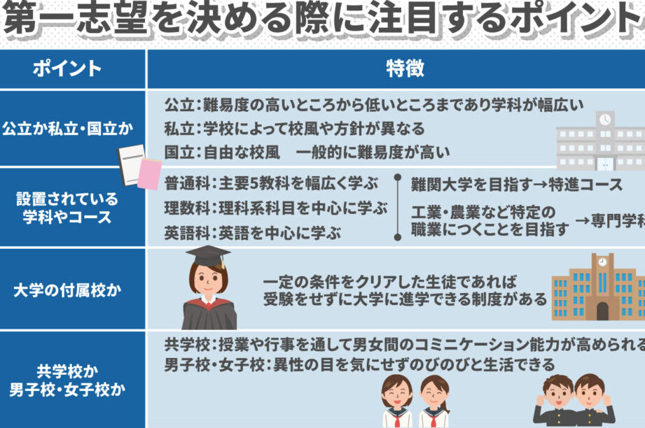 高校受験を成功させるためには、志望校選びにおいていくつかの重要なポイントと注意点があります。私たちが考慮すべき主要な要素は以下の通りです。これらを踏まえて、自分に最適な学校を見つけ出すことが求められます。