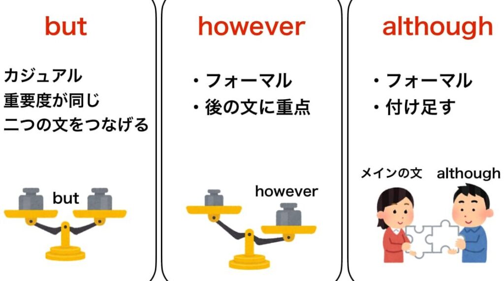 - ニュアンス:意図したメッセージによって最適な接続詞を決定する。