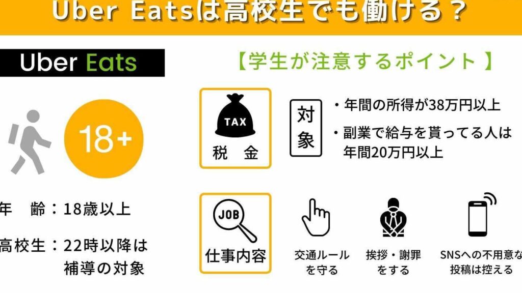 | ウーバーイーツ | 18歳以上(未成年者は親同意必要) | 必須(17歳以下の場合) |