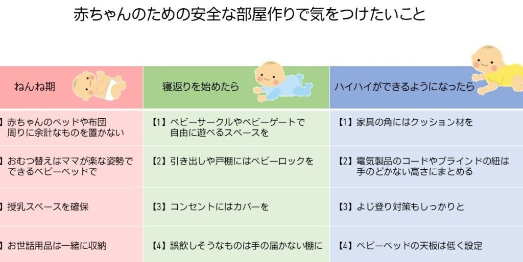 私たちは乳児にとって安全で刺激的な環境を提供することが求められます。そのためには次のポイントに注意しましょう: