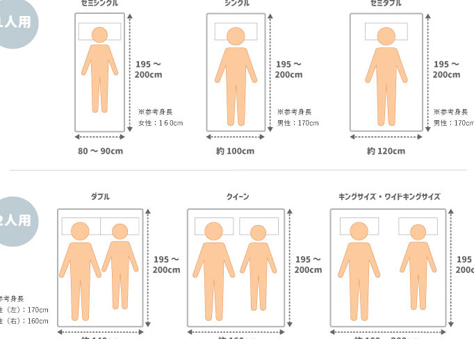 - ダブル: 二人で使用しても十分な幅があり、多くの場合標準的な選択肢となります。