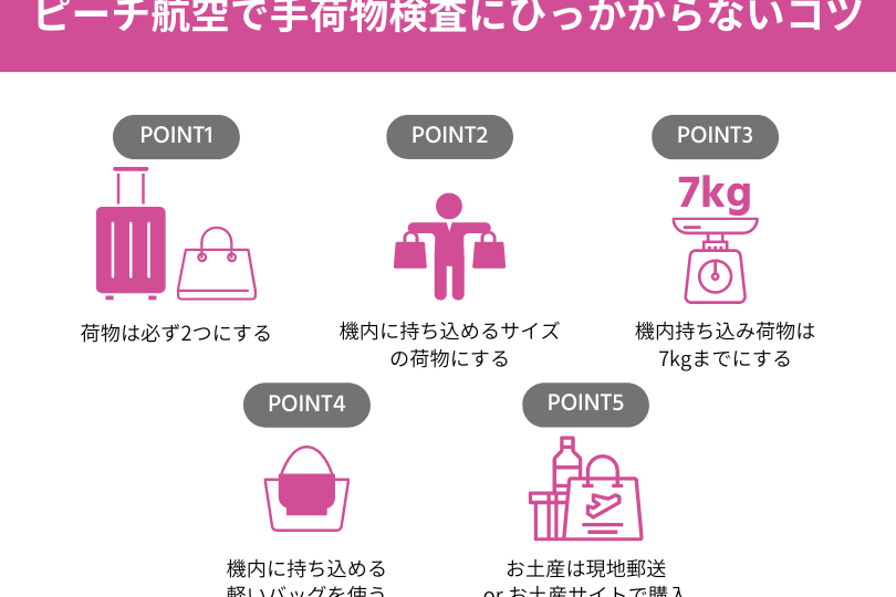 このように、ピーチ航空では手荷物とチェックイン 荷物それぞれ異なるルールがありますので、自分自身のお持ち込み予定品を考慮しながら計画を立てることが大切です。